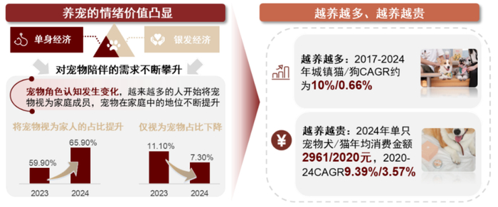 宠物陪伴需求提升,体现在宠物越养越多、越养越贵,从朋友到家人。随着单身经济和银发经济的蓬勃发展,社会对宠物陪伴的需求持续增长,宠物角色认知持续升级。
