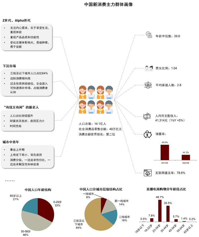注:1)平均家庭人数、人口年龄结构、储蓄率数据均只披露至2023年,直播电商购物分年龄段数据为2025年3月统计,其余数据时间均为2024年;2)城市层级按照第一财经(https://www.yicai.com/news/102130290.html)标准进行划分