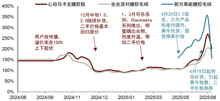 潮玩品类具备一定的“社交货币”属性,隐含二手价格炒作机会。我们认为,对于潮玩以及泛娱乐产品而言,其热度的基础往往在于优质的形象设计,以及稀缺的属性(限量发售、隐藏款),能够成为部分核心用户圈层表达审美与个性的媒介,进而再通过开箱、搭配、社交媒体展示等方式收获“社交认同感”。在此之后,往往会吸引“路人粉”关注、自然传播,而由于产品稀缺产生二级交易市场,从而吸引“黄牛”热钱进入市场,快速推高二级市场交易价格、推高舆论流量热度。