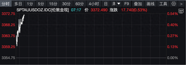 7月14日周一,黄金高开高走。截至发稿,伦敦金现最新报3372.49美元/盎司,涨幅为0.53%。