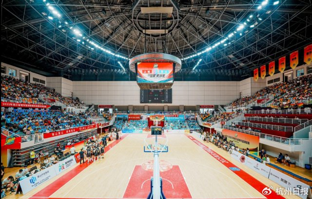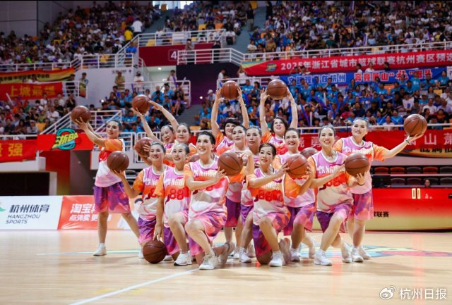 有意思的是,这场比赛的观众也是中场休息的表演嘉宾!来自萧山楼塔,登上过杭州亚运会开幕式的“浪花奶奶”们从观众席走向球场中央,为大家带来精彩的篮球表演。奶奶们说,最近她们每天训练两小时,“表演为大家,但内心为萧山加油,拿第一!”
