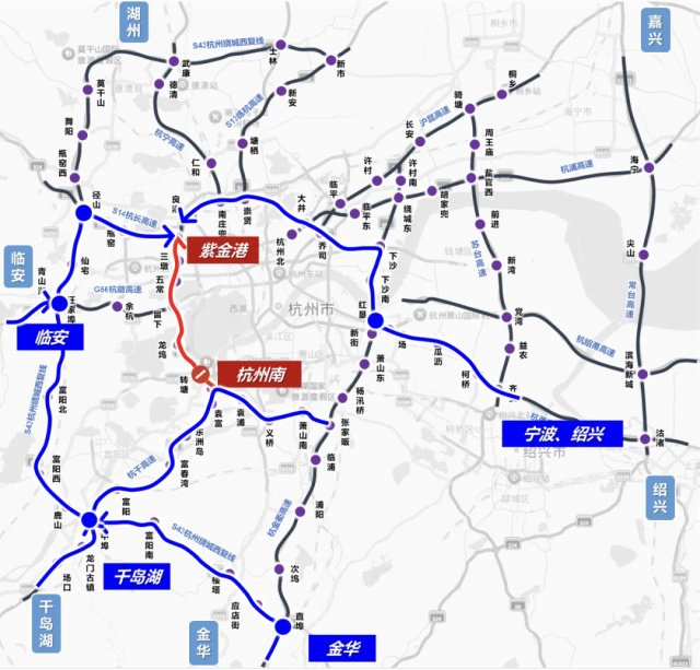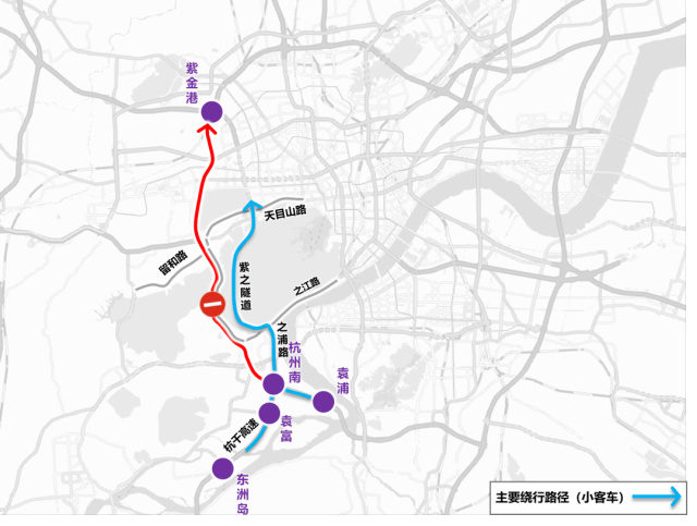 2.近端地面小客车绕行路线:提前于袁浦、袁富或杭州南收费站下高速,通过袁浦路、袁富路、科海路、云河街、之浦路、紫之隧道等道路绕行。