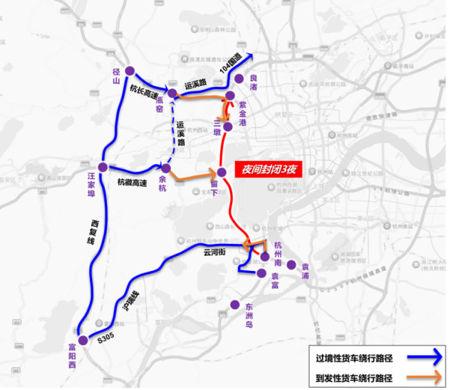 3.近端地面货车绕行路线:提前于袁富或杭州南收费站下高速,通过之浦路、云河街、沪瑞线、305省道、S43绕城高速西复线、运溪路、104国道等道路绕行。到发货车具体绕行路线请使用杭州货运导航系统。