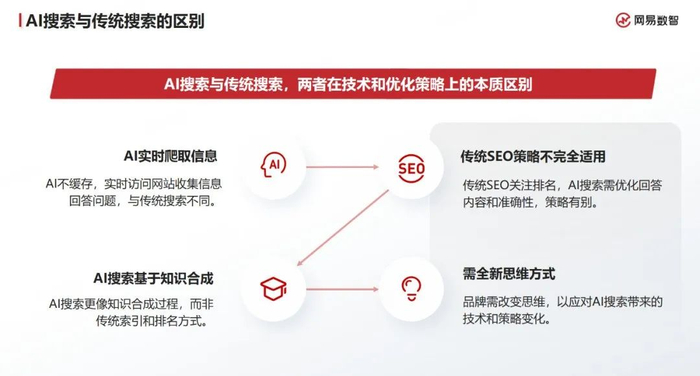 GEO ,全称 Generative Engine Optimization,即“生成式引擎优化”,这是继 SEO 之后的新一代内容优化策略,通过提升内容的结构化、语义清晰度、知识可信度,使其更容易被 AI 引擎引用、理解、生成。在开展 GEO 工作之前,我们需要理解 AI 搜索与传统搜索在技术和优化策略方面的差异:首先,AI 不缓存,能实时访问网站收集信息回答问题;其次,传统 SEO 关注排名,AI 搜索更侧重答案的准确性;另外,AI 搜索更像是一个知识合成的过程,并不会像传统索引直接呈现结果,而是结合多方信源合成一个最终的答案。
