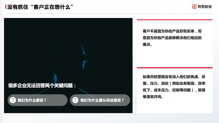 当前很多营销团队没有解决好的问题是:没有抓住客户正在想什么。这其中的两个关键问题分别是:他们为什么要买你的产品?他们为什么要从你这里买?我觉得需要解决的一个误区是,很多人认为客户是因为你的产品好才买单的,但实际上更多情况是你的产品恰好能解决他们相应的痛点,所以我常常跟我们团队小伙伴开玩笑说,营销工作要深入到人类的“七宗罪”中,你的营销要深入到客户的焦虑、恐惧、压力、目标等等环节,设身处地站在客户角度考虑才能激发他们的共鸣。因此我会要求我们团队成员必须跟着销售去一线跑客户,做活动必须得在现场跟观众聊一聊他们来参加活动的关注点是哪些,光听前线同事转述来做判断、做营销没法真切感受到客户的焦虑、恐惧、压力等等,只能“隔靴搔痒”。