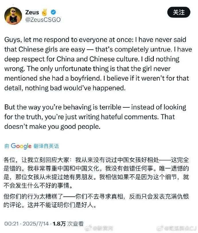 7月14日,Zeus在社交平台发文回应,他表示,自己没想过伤害任何人,并把矛头指向女生刻意隐瞒有男朋友的事实;同时他辟谣了网传结婚传闻,希望能尽快结束此事,喊话网友停止仇恨言论。