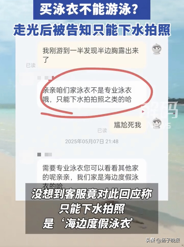 女子穿新泳衣游泳走光,质疑设计不合理,商家回应:不是专业泳衣,只能下水拍照