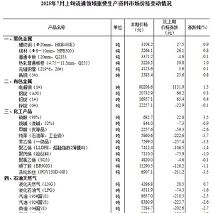 中新经纬7月14日电 14日,国家统计局公布7月上旬流通领域重要生产资料市场价格变动情况。