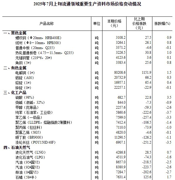 国家统计局称,据对全国流通领域9大类50种重要生产资料市场价格的监测显示,2025年7月上旬与6月下旬相比,23种产品价格上涨,23种下降,4种持平。