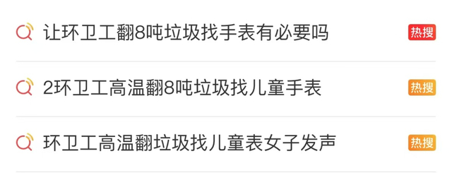 7月13日,“2环卫工高温翻8吨垃圾找儿童手表”等多个话题登上微博热搜。