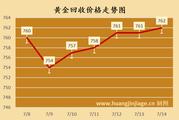 今日黄金回收价格每克762元,铂金回收价格每克297元,钯金回收价格每克245元,18K金回收价格每克549元,白银回收价格每克6.5元。(黄金行情是波动的,以结算价格为准。)