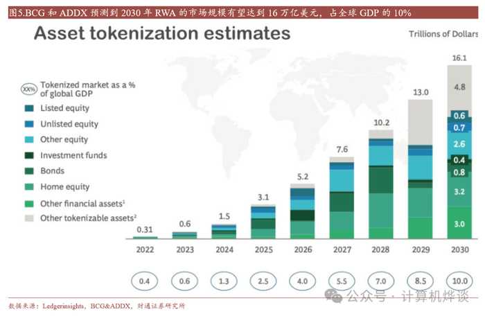 未来空间:根据BCG和ADDX联合预测,到2030年RWA的市场规模有望达到16万亿美元,占全球GDP的10%。