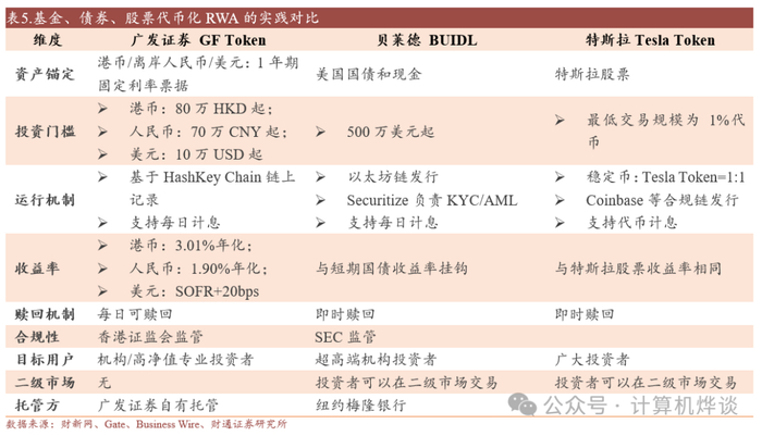 债券代币化:将传统债券转化为数字代币形式。典型案例:广发证券代币化证券(GF Tkoen),目前仅面向机构投资者或高净值个人。