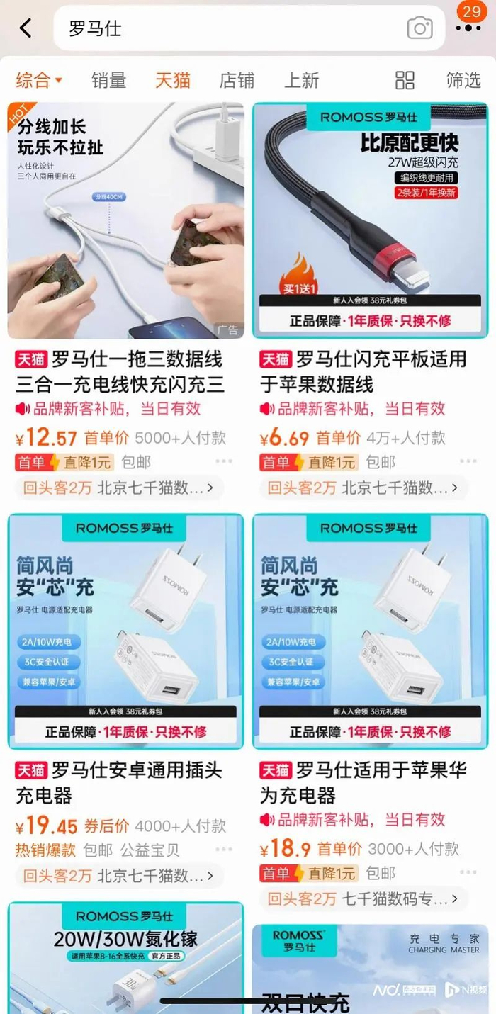 记者发现,截至目前,罗马仕已关闭天猫和淘宝店铺。罗马仕京东自营旗舰店虽然仍正常运营,但在售产品仅充电线、充电头。抖音罗马仕官方旗舰店内无在售产品。