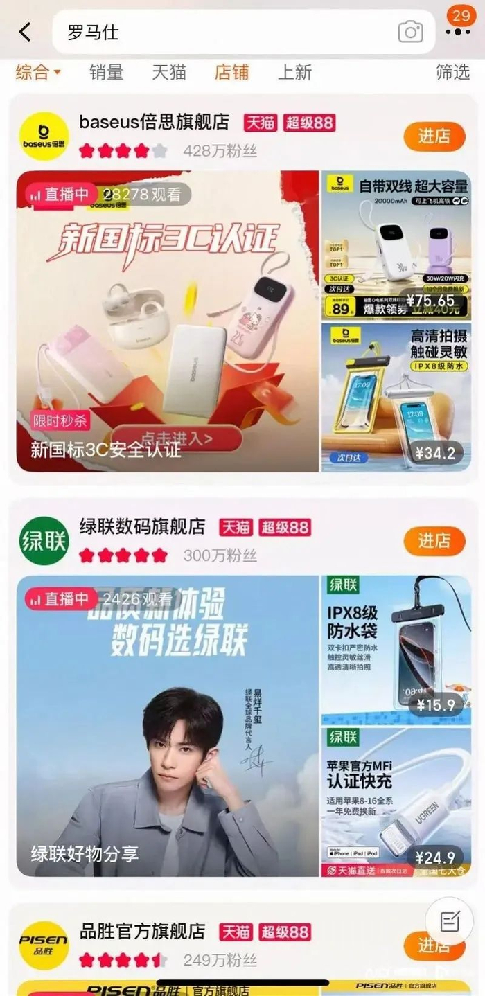 7月8日,记者注意到,罗马仕现已关闭天猫和淘宝店铺,搜索后未出现官方店铺。此前,该店铺下架多数产品,仅剩一款充电线在售。