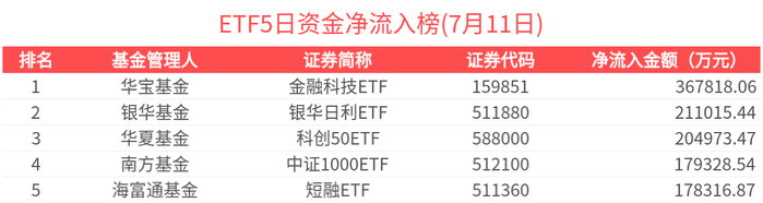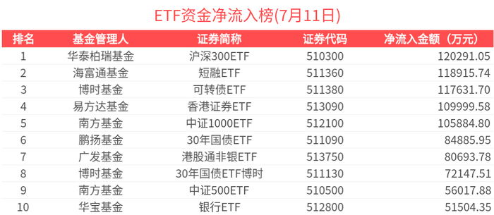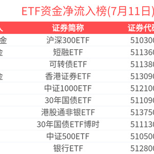 2025年7月11日共268只ETF基金获资金净流入,437只ETF基金净流出。净流入金额超1亿元的有40只,沪深300ETF(510300.SH)、短融ETF(511360.SH)、可转债ETF(511380.SH)、香港证券ETF(513090.SH)、中证1000ETF(512100.SH)资金显著流入,分别净流入12.03亿元、11.89亿元、11.76亿元、11.00亿元、10.59亿元(净申购份额*单位净值)。