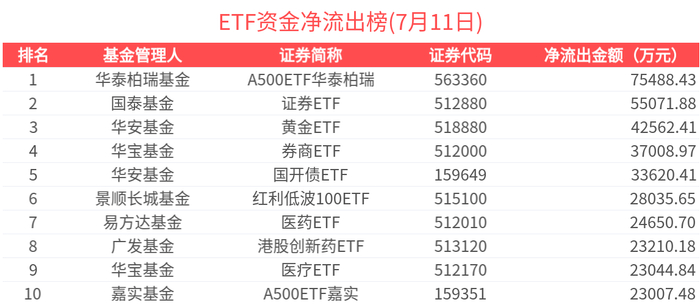 净流出金额超1亿元的有17只,A500ETF华泰柏瑞(563360.SH)、证券ETF(512880.SH)、黄金ETF(518880.SH)、券商ETF(512000.SH)、国开债ETF(159649.SZ)资金显著流出,分别净流出7.55亿元、5.51亿元、4.26亿元、3.70亿元、3.36亿元(净赎回份额*单位净值)。