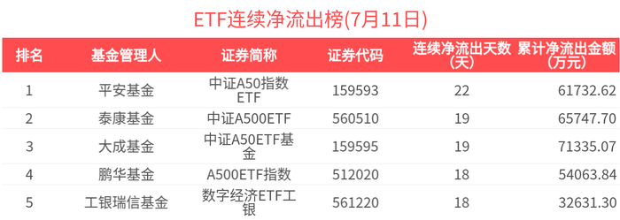 连续净流出的ETF基金有248只,居前的为中证A50指数ETF(22天)、中证A500ETF(19天)、中证A50ETF基金(19天)、A500ETF指数(18天)、数字经济ETF工银(18天),分别净流出6.17亿元、6.57亿元、7.13亿元、5.41亿元、3.26亿元。其中,中证A50指数ETF近22天加速流出,近22天累计流出6.17亿元,基金规模快速下降至66.26亿元。
