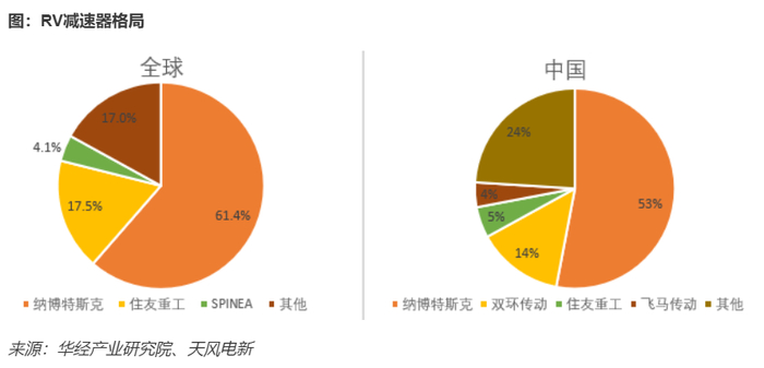 摆线减速器是RV减速器的一种,暂无细分的摆线减速器格局数据,但大致看摆线格局和RV减速器格局类似,全球龙头为纳博特斯克(占比6成)、住友重工、SPINEA,国内龙头为双环传动(子公司环动科技)、飞马等。