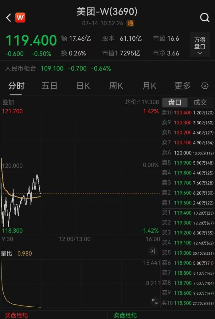 记者注意到,截至7月11日收盘,美团股价报收120港元/股;6月份以来,美团股价下跌幅度约为11%。7月14日,美团低开后股价震荡,截至发稿,跌幅为0.5%,每股报119.4港元,总市值7295亿港元。