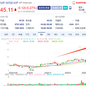 “芒廷山口”是美国唯一掌握稀土“采矿-分离-磁体制造”全链条的企业。美国官方还跟这家企业签了10年协议,以 110美元/公斤 的保底价采购钕镨产品(当前中国市场价格约52美元/公斤)。