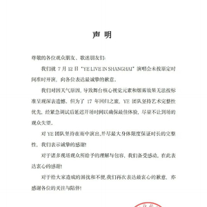 7月13日23时许,YE上海演唱会主办方@上海星珀文化StellarAmberGroup发布声明,就美国说唱歌手“侃爷”(Kanye West)7月12日的“YE LIVE IN SHANGHAI”演唱会未按原定时间准时开演致歉。