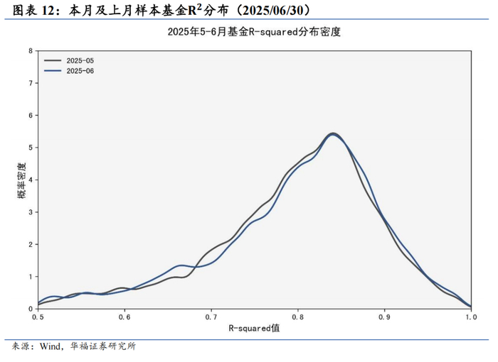 通过基金相对单一指数拟合优度判定公募基金整体策略变化。5月平均值0.7981,超0.9占比10.63%,低于0.7占比14.11%;6月平均值0.799,超0.9占比11.86%,低于0.7占比14.97%,整体变化不大。
