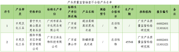 近日,广东省市场监督管理局发布2024年照明光源及灯具等13类农贸市场日用消费品产品质量监督抽查情况。其中,抽查发现2款日用及化工品不合格,均为洗衣液,不合格项目为总活性物。