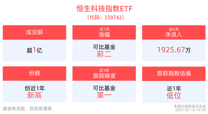 跟踪精度方面,截至2025年7月11日,恒生科技指数ETF近3年跟踪误差为0.047%,在可比基金中跟踪精度最高。