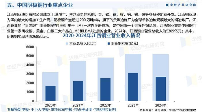 江西铜业股份有限公司成立于1979年,主营业务包括铜、金、银、铅、锌、钨、铼、碲等多品种矿业开发。江西铜业现为国内最大的铜加工生产商,阴极铜产量超过 200 万吨/年,旗下的贵溪冶炼厂为全球单体冶炼规模最大的铜冶炼厂。江西铜业的“贵冶牌”阴极铜早在1996 年于 LME一次性注册成功,是中国第一个世界性铜品牌,江西铜业亦是中国铜行业第一家阴极铜、黄金、白银三大产品在LME和LBMA注册的企业。2024年,江西铜业营业总收入为5209亿元;其中,阴极铜实现营收2685亿元。