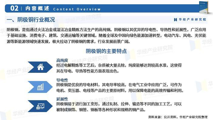 阴极铜,是指通过火法冶金或湿法冶金精炼方法生产的高纯铜。阴极铜以其优异的导电性、导热性和延展性,广泛应用于基础设施、消费电子、建筑、交通运输等关键领域。随着全球及中国向绿色能源加速转型,电动汽车、风电、光伏能源等新能源领域快速发展,极大拉动了阴极铜的需求,行业发展前景广阔。