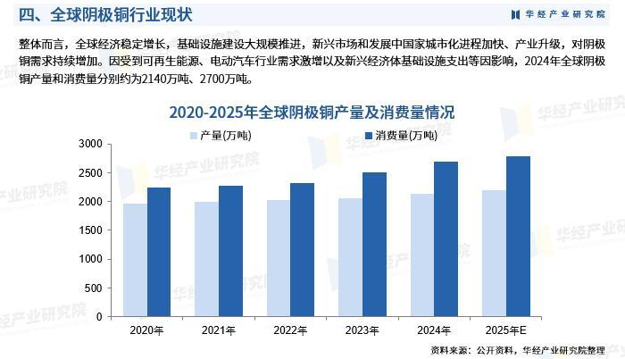 整体而言,全球经济稳定增长,基础设施建设大规模推进,新兴市场和发展中国家城市化进程加快、产业升级,对阴极铜需求持续增加。因受到可再生能源、电动汽车行业需求激增以及新兴经济体基础设施支出等因影响,2024年全球阴极铜产量和消费量分别约为2140万吨、2700万吨。