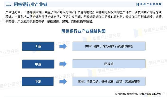 产业链方面,上游为供应端,涵盖了铜矿开采与铜矿石资源的初选;中游则是阴极铜的生产环节,涉及铜精矿的冶炼或精炼,主要包括火法冶炼与湿法冶炼方法;下游为应用端,阴极铜是铜加工的核心原材料,经过加工可制成铜棒、铜管、铜箔等,广泛应用于消费电子、基础设施、建筑、交通运输等领域。