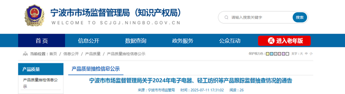宁波市市场监督管理局公布2024年电子电器、轻工纺织等产品跟踪监督抽查情况通告