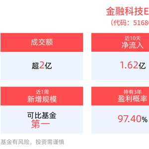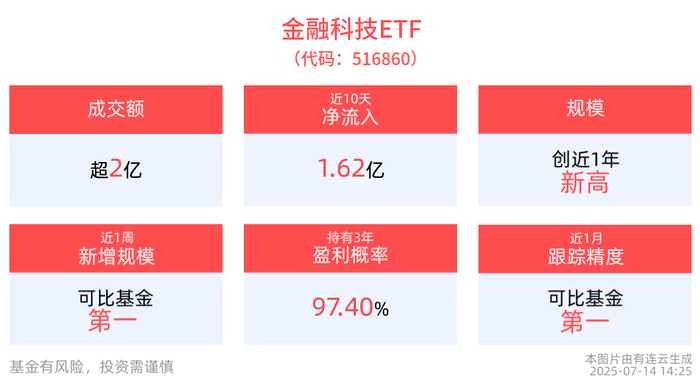 规模方面,金融科技ETF最新规模达11.14亿元,创近1年新高。