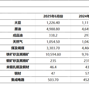 1-6月大豆、原油进口增长,成品油、煤炭进口下降