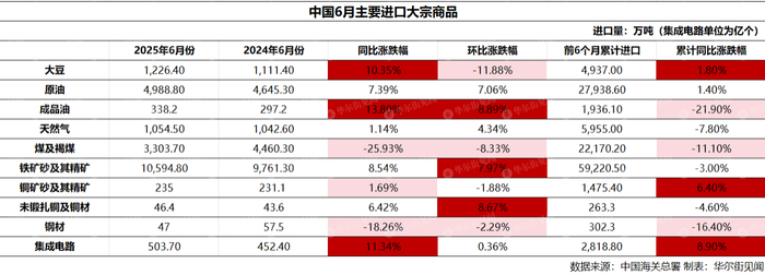 今年前6个月,大豆、原油等大宗商品进口量增长,而天然气、煤等大宗商品进口则下跌。