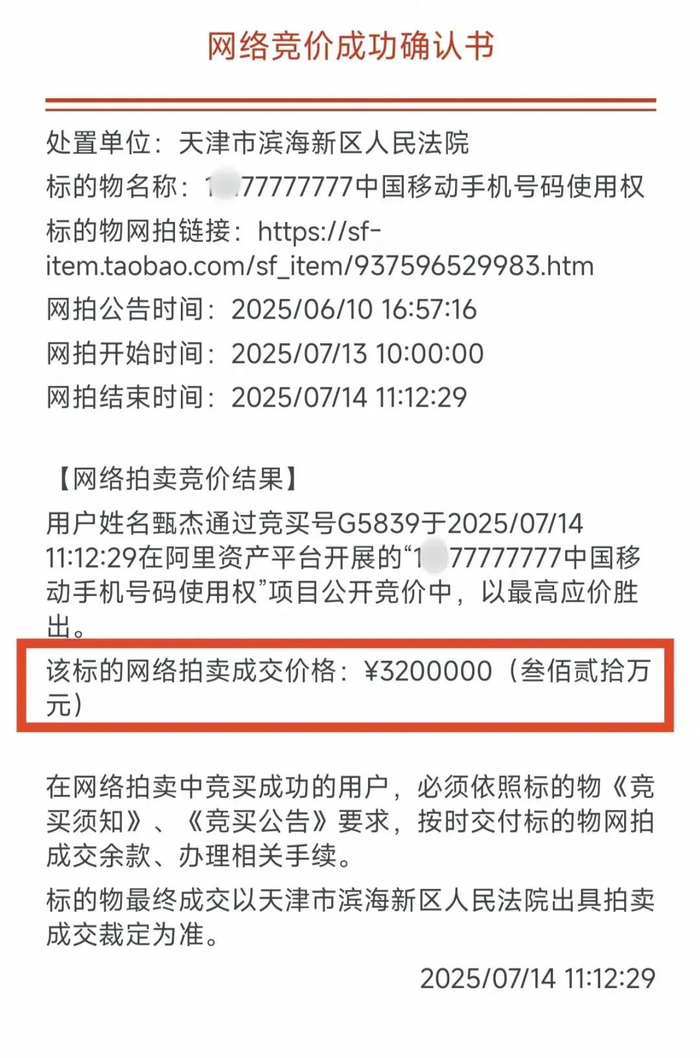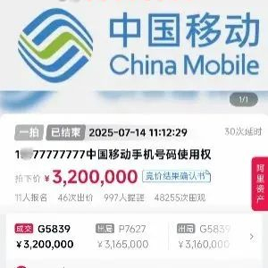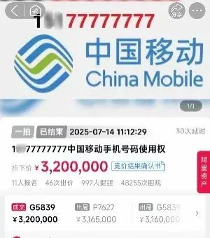 7月14日,记者从阿里资产拍卖平台看到,手机靓号1**77777777使用权,经过角逐,成功拍出320万元高价。此前,亦有一个尾号8个7的手机号使用权拍出了285.2万元。