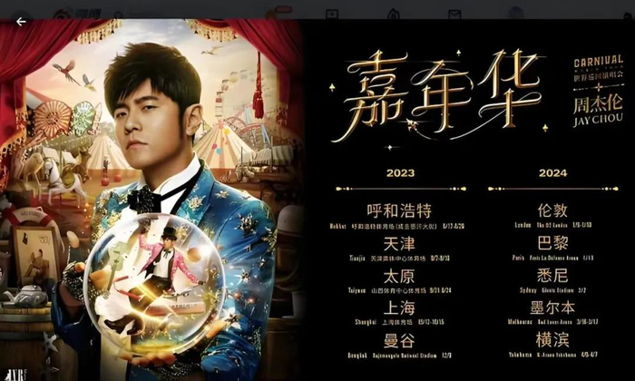 2024年,周杰伦"嘉年华"世界巡回演唱会举办42场,有分析估计总收入达23亿元。按照行业惯例,头部艺人能获得70%左右的分成,这意味着周杰伦团队仅演唱会一项就可收入超16亿元。