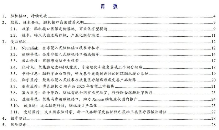 我们看好政策和技术共振下脑机接口投资机会,受益标的包括岩山科技、中科信息、狄耐克、瑞迈特、翔宇医疗、创新医疗、诚益通、塞力医疗、爱朋医疗、盈趣科技等。