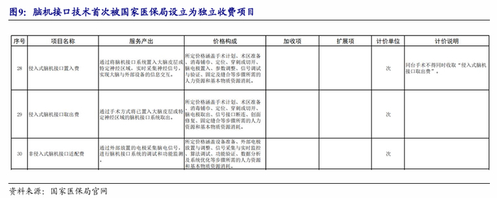 脑机接口技术首次被国家医保局设立为独立收费项目。2025年3月12日,国家医保局发布《神经系统类医疗服务价格项目立项指南(试行)》,参考2023年版医疗服务项目技术规范,将现行神经系统价格项目映射整合为82项,加收项24项,扩展项8项。《指南》首次将脑机接口技术设立为独立收费项目。指南中设立了侵入式脑接口置入费、侵入式脑机接口取出费、非侵入式脑机接口适配费等多个收费项目,为将来脑机接口技术迈向成熟后商业化临床应用奠定基础。
