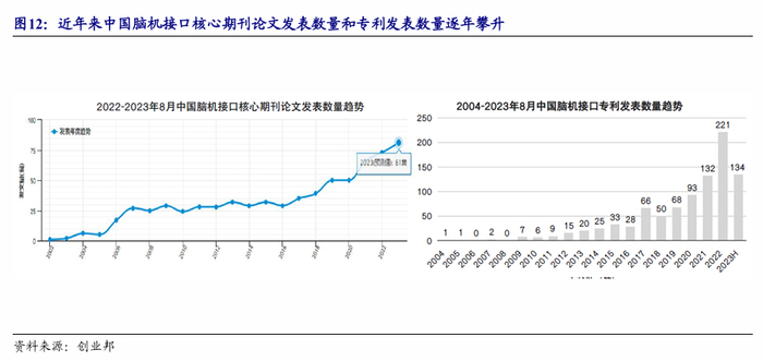 国内脑机接口领域技术快速提升。我国脑机接口行业起步较晚,但在各大科研院校及相关企业的努力下,我国脑机接口行业正在加快追赶步伐。近10年左右,中国脑机接口核心期刊论文发表数量和专利发表数量逐年攀升。
