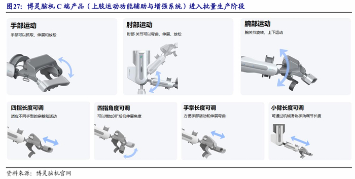 博灵脑机C端产品已进入批量生产阶段,公司预计将于2025年陆续实现上市销售。博灵脑机采用脑机接口技术开发的C端产品(上肢运动功能辅助与增强系统),主要针对中风偏瘫患者出院后的居家日常生活场景使用,不受时间、场地和训练时长等传统院内康复训练手段的限制。系统能够精准识别偏瘫患者的运动意图,实现患者自主完成患侧肢体的肘部抬放和手部张合,能较好提升其基本生活自理能力,有助于降低疾病经济压力、减轻家庭照护负担。