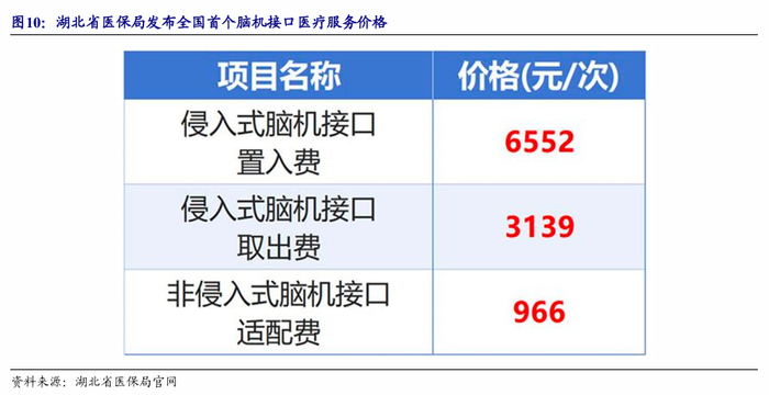 2025年3月脑机接口技术首次被国家医保局设立为独立收费项目,随后湖北省医保局发布全国首个脑机接口医疗服务价格,侵入式脑机接口置入费/侵入式脑机接口取出费/非侵入式脑机接口适配费价格分别为6552/3139/966元/次,填补脑机接口医疗服务的价格空白,有望加快落地脑机接口落地运用。