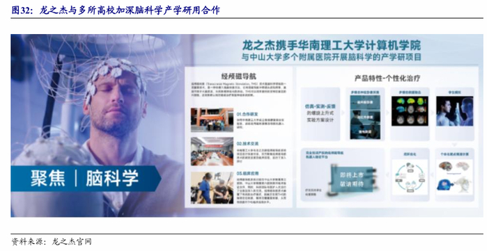 近年来龙之杰开展了脑机接口技术的一系列有益探索和实践,公司已立项研发的经颅磁刺激仪和经颅电刺激仪在2024年陆续注册上市。同时龙之杰还与多所高校加深产学研用合作,共同研发了基于三维影像学分析的经颅磁辅助定位治疗机器人等脑机接口相关的产品和技术为发展新质生产力蓄势赋能。