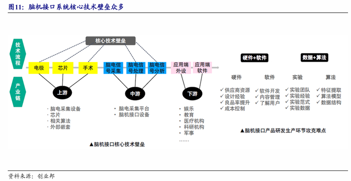 脑机接口系统核心技术壁垒众多。非侵入式主要在脑科学的基础研究、AI算法等;侵入式主要在电极、芯片、临床诊疗,产品研发和上市流程相对更复杂。同时,在产品研发和迭代的过程中,目前最大的技术挑战之一是平衡性能、可用性、可商业化等因素,同时符合政策审批要求,未来有可能会涉及伦理、隐私安全等社会问题,更加考验企业的市场化策略和资源整合能力。
