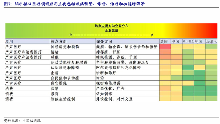 医疗领域应用主要包括疾病预警、诊断、治疗和功能增强等。主要面向的疾病包括癫痫、帕金森、抑郁、疼痛、多动症、自闭症、截瘫、卒中、阿尔兹海默症、意识障碍、耳鸣和听力受损、视力受损和睡眠障碍等,以及利用脑状态辅助药物研发和麻醉监测给药。