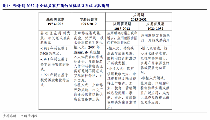 预计到2032年全球多家厂商的脑机接口系统成熟商用。根据中国信通院的梳理,1973至1992年为基础研究期,特点是基础理论得到发展。P300、SSVEP、运动想象等范式诞生。1993至2012年为实验验证期,特点为上中游逐渐成熟以为科研实验提供技术和设备,实验的广泛开展使得技术不断积累和迭代。2004年美国FDA批准BrainGate可侵入人体为广泛开展临床试验奠定基础。多例知名实验证实人体和动物可通过不同范式实现脑控机械臂、脑控光标等外设。