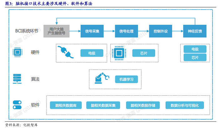 脑机接口技术主要涉及硬件、软件和算法,其中硬件主要包括用于脑电信号采集或神经反馈的电极和用于信号处理的芯片,算法主要是用于信号处理的机器学习,软件则是关于脑相关数据的处理和管理。
