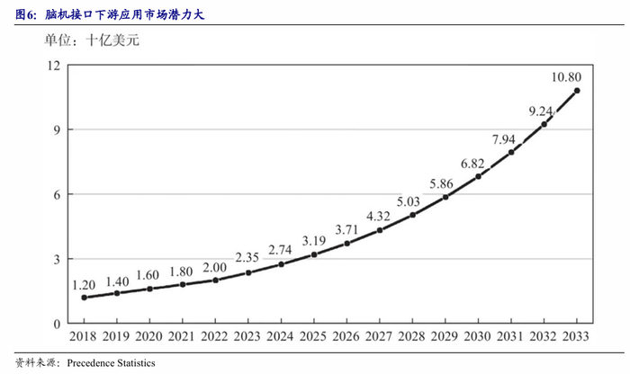 脑机接口下游应用市场潜力大。Precedence Statistics数据显示,2023年全球脑机接口市场规模为23.5亿美元,预计2023年-2033年复合增长率将达到16.55%。